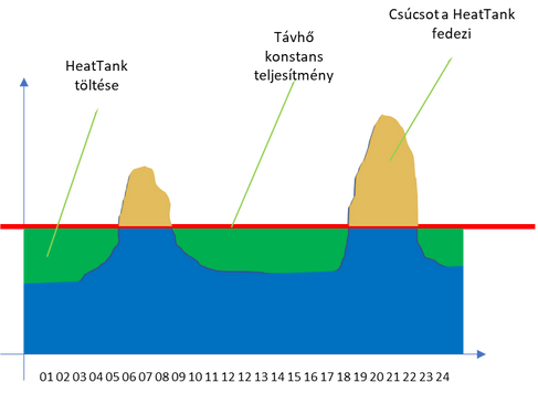 A fenti ábrán a távhő termelése látható, kék színnel hőakkumulátor nélküli és zöld színnel hőakkumulátor melletti esetben. Szürke színnel napelemek termelése látható. Mivel a napelem termelése 12 és 16 óra között a legnagyobb, amikor az igények alacsonyabbak, ezért a megtermelt energia egy része nem kerül felhasználásra. Hőakkumulátor segítségével ezt el lehet tárolni és később hasznosítani.